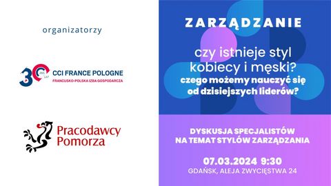 CCIFP oraz Pracodawcy Pomorza mają przyjemność zaprosić na dyskusję ekspertów oraz networking: Zarządzanie - czy istnieje styl kobiecy i męski?