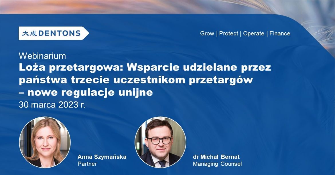 Kancelaria Dentons zaprasza na webinarium, w trakcie którego Anna Szymańska oraz dr Michał Bernat omówią nowe, obowiązujące od 2023 roku przepisy unijne, które powyżej określonych progów zobowiązują uczestników przetargów do uprzedniego zgłaszania Komisji Europejskiej wsparcia finansowego udzielonego im przez państwa trzecie.