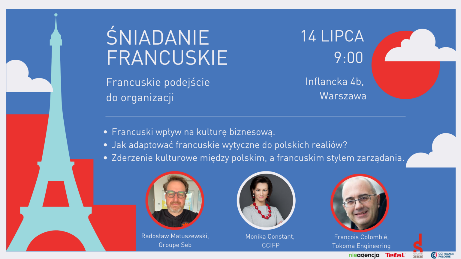 Śniadanie będzie pierwszym z cyklu, który powróci po pandemii. Przed marcem 2020 roku Nieagencja organizowała takie śniadania w swojej ówczesnej siedzibie. W 2022 roku powraca do idei tych inspirujących i niezobowiązujących spotkań. Pierwsze z nich będzie dotyczyło francuskiego wpływu na polską kulturę biznesu i organizacji. Gośćmi spotkania będą Radek Matuszewski, szef Tefal w Polsce, Monika Constant, dyrektor Francusko-Polskiej Izby Gospodarczej, a także François Colombié, CEO Tokoma Engineering S.A. oraz Wiceprezes Francusko-Polskiej Izby Gospodarczej.