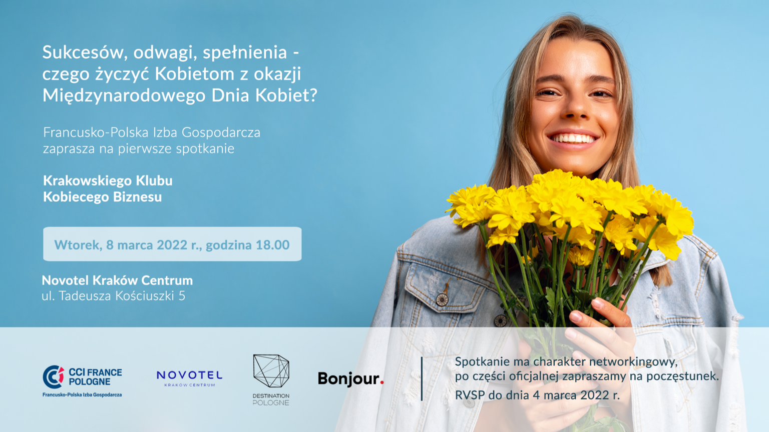 Francusko-Polska Izba Gospodarcza ma przyjemność inaugurować działanie Krakowskiego Klubu Kobiecego Biznesu – inicjatywy dedykowanej kobietom na stanowiskach kierowniczych z firm stowarzyszonych i zaprzyjaźnionych CCIFP. Idea utworzonego Klubu? Wspieranie w rozwoju zawodowym i tworzenie wzmacniającej sieci dla przedsiębiorczyń z regionu. Na pierwsze spotkanie Krakowskiego Klubu Kobiecego Biznesu zapraszamy już we wtorek, 8 marca 2022 r., o godzinie 18.00 do Hotelu Novotel Kraków Centrum.