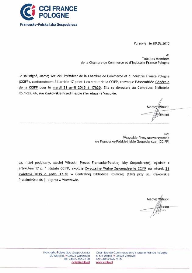 Ja, niżej podpisany, Maciej Witucki, Prezes Francusko-Polskiej Izby Gospodarczej, zgodnie z artykułem 17 p. 1 statutu CCIFP, zwołuję Zwyczajne Walne Zgromadzenie CCIFP na wtorek 21 kwietnia 2015 o godz. 17.30 w Sali Odczytowej Centralnej Biblioteki Rolniczej, ul. Krakowskie Przedmieście 66 (1 piętro) w Warszawie.