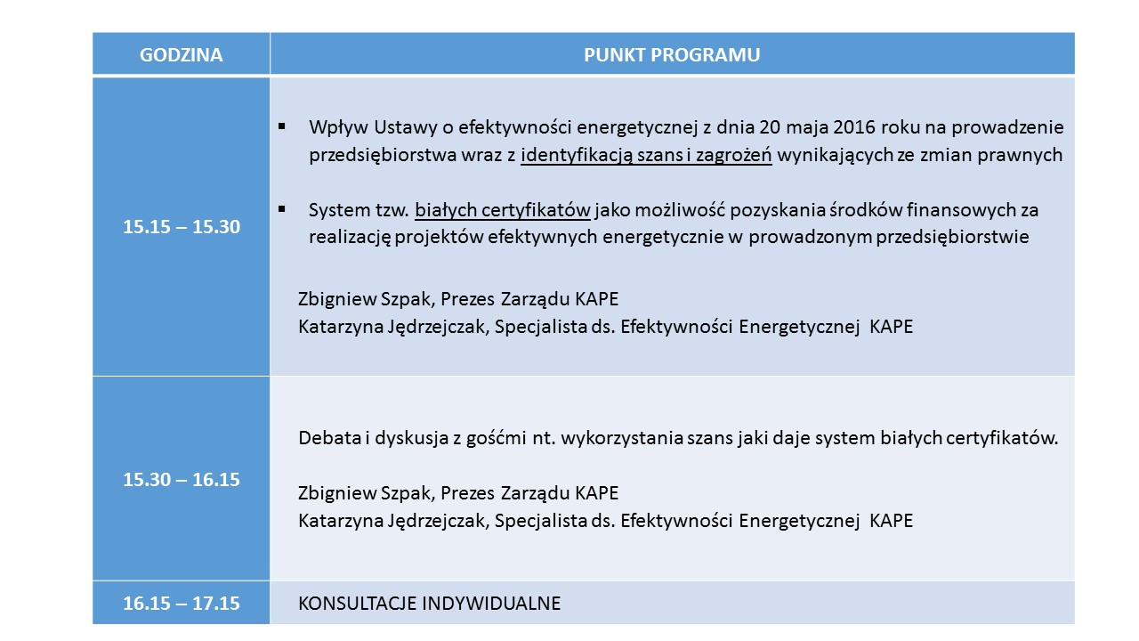 Celem spotkania jest wsparcie przedsiębiorców w odnalezieniu się w obecnej sytuacji legislacyjnej i jak najlepszym wykorzystaniu ostatniej szansy na pozyskanie białych certyfikatów na dotychczasowych zasadach. Celem jest także zapoznanie Państwa z ide? Ustawy oraz z jej wpływem na finanse przedsiębiorstwa jak i poinformowaniu o szansach i nowych obowi?zkach po uchwaleniu nowej Ustawy o efektywności energetycznej, maj?cej wejść w życie z dniem 1 października 2016 r.